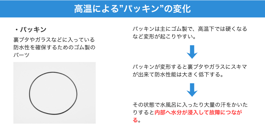 防水性能はあくまで“水圧”への耐性であり、“高温”への耐性とは別問題なのです。